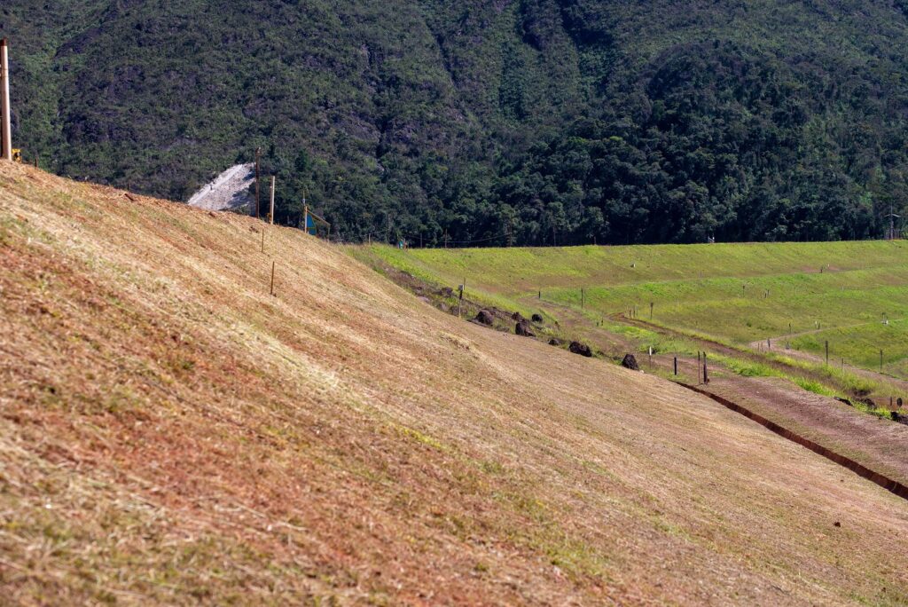 Inclinação em uma encosta ou corte, como em uma mina a céu-aberto, ou de uma pilha de rejeitos ou barragem